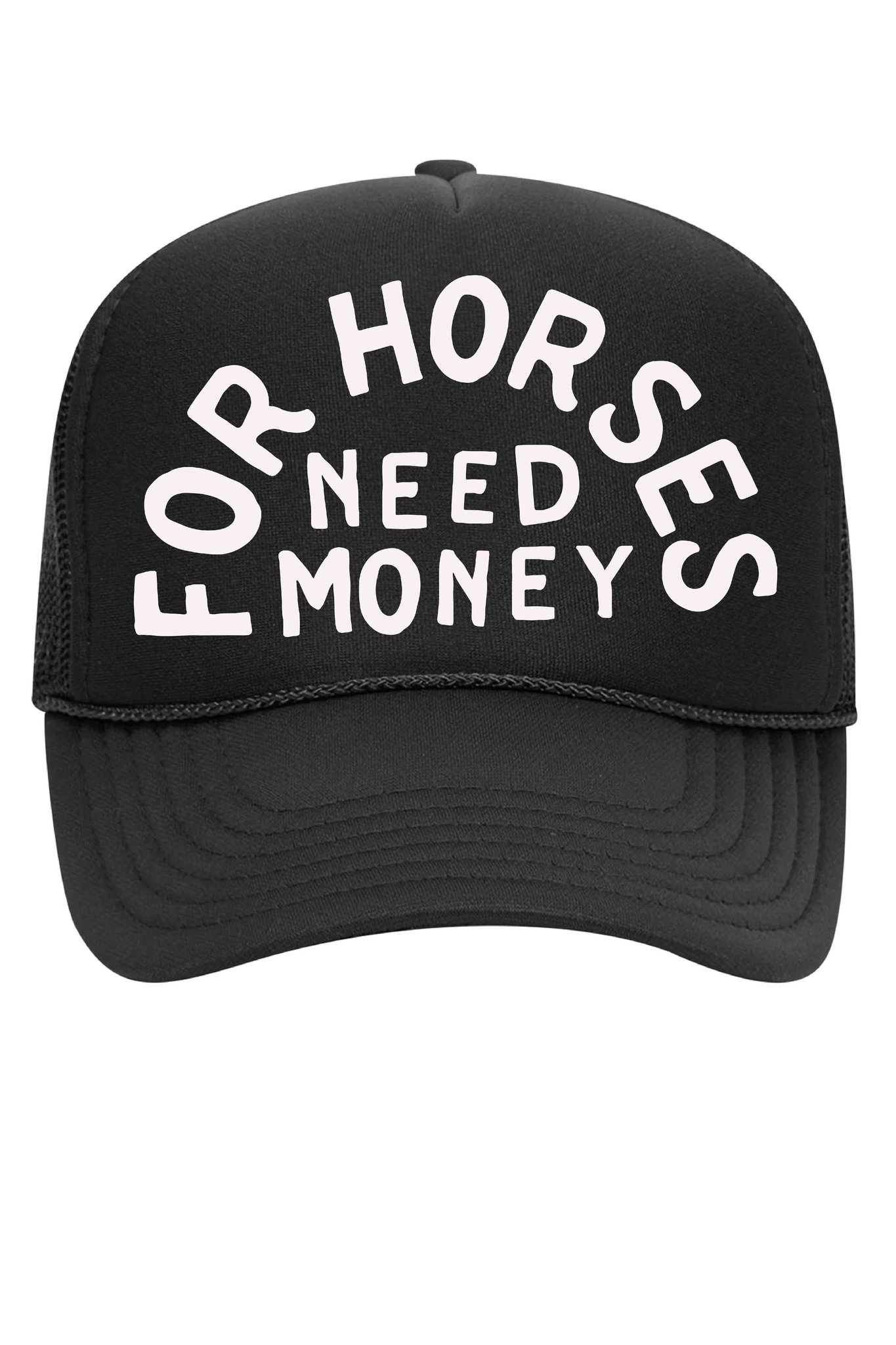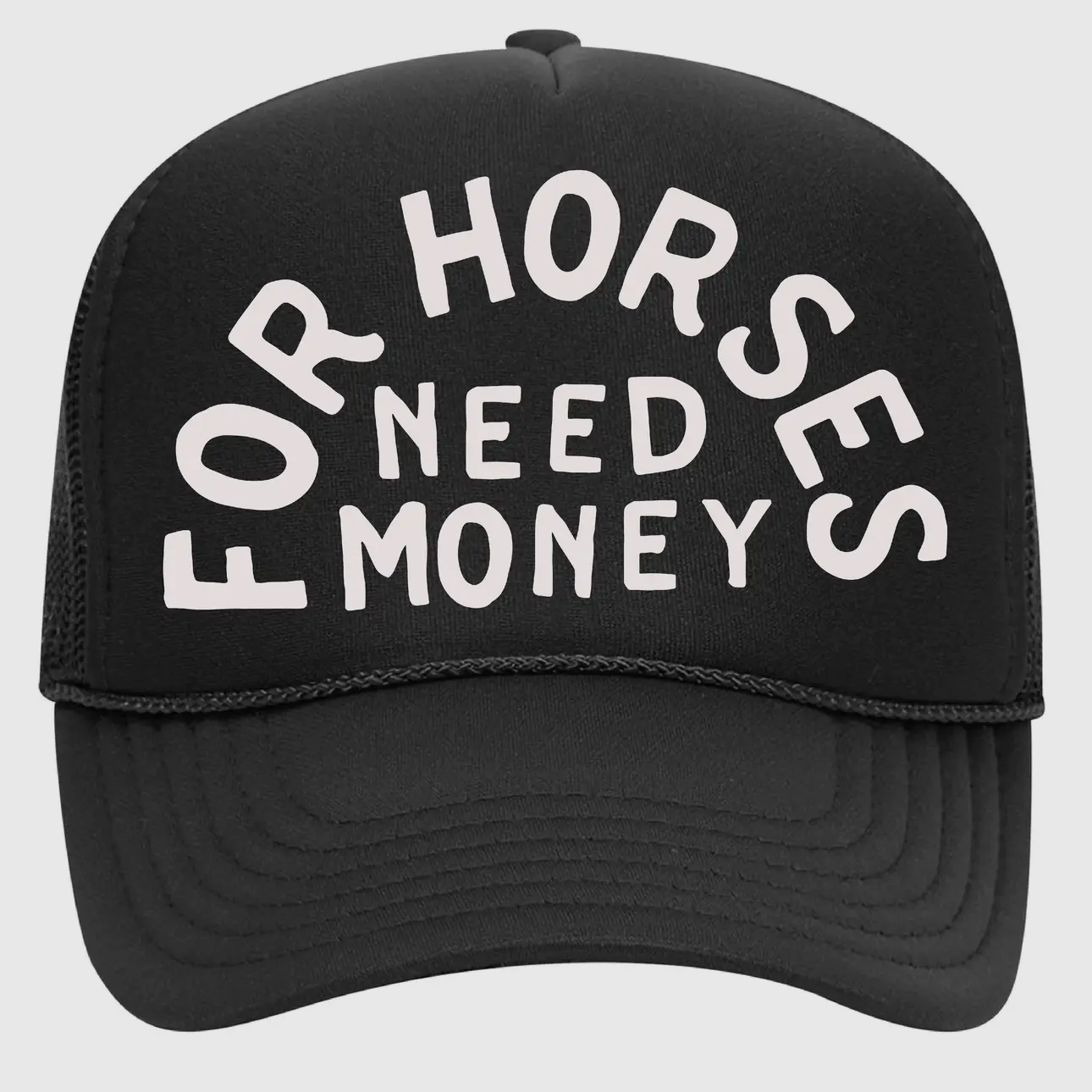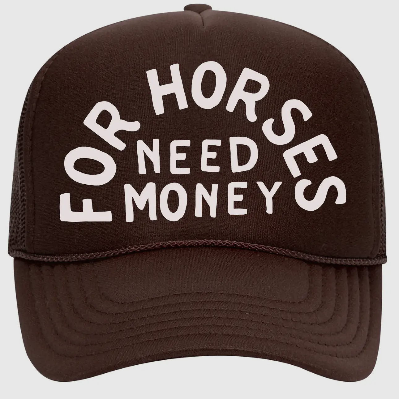 For Horses Need Money Trucker style foam puff print cap. This unisex cap is a nod to vintage aesthetics and comes in brown or black.