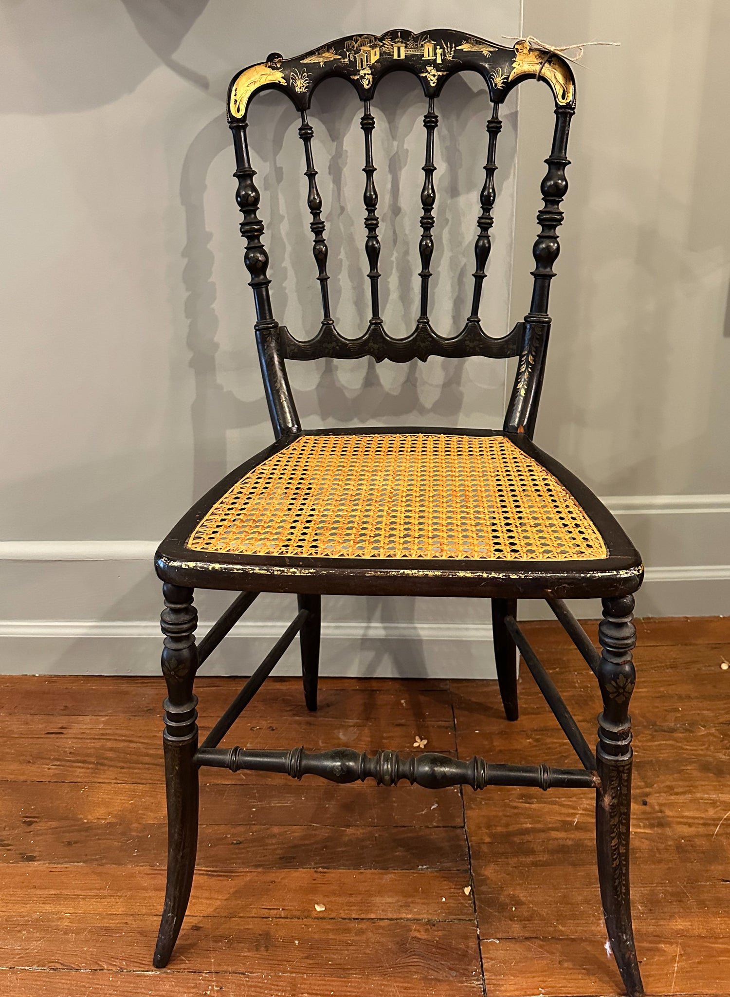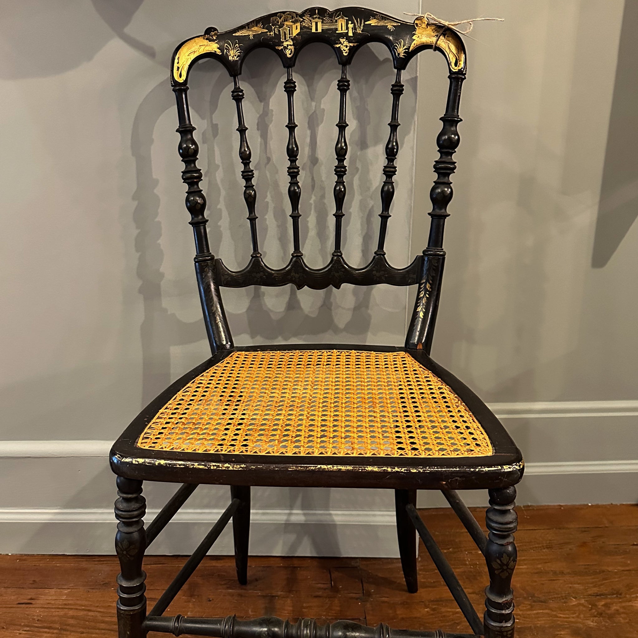 Charming little painted black Vintage Chinoiserie Chair with cane seat. Measures approx. 34" tall x 15.5" wide x 17.5" seat height. Please note, this chair is for local pick-up only.