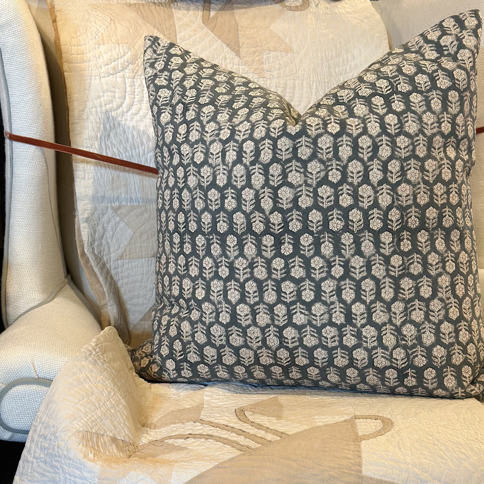 Hand Block Printed Duck Canvas Toss Pillow with little floral repeat and down alternative insert. Measures 22" x 22". Designed with a hidden zipper and clean knife edge detail. Featuring the age-old Bagru Printing technique, renowned for its intricate motifs and cultural significance, each piece is a testament to impeccable handmade craftsmanship.