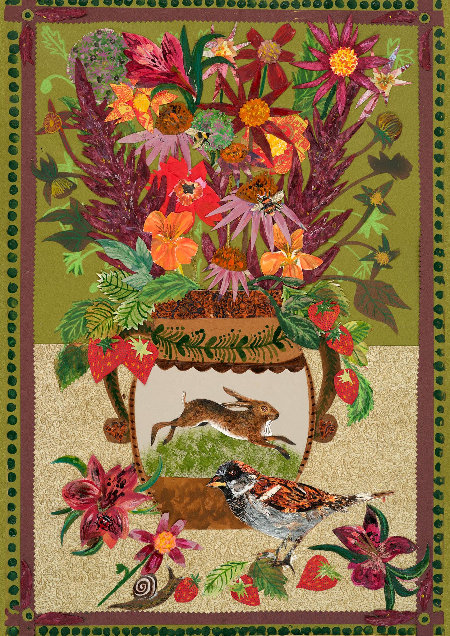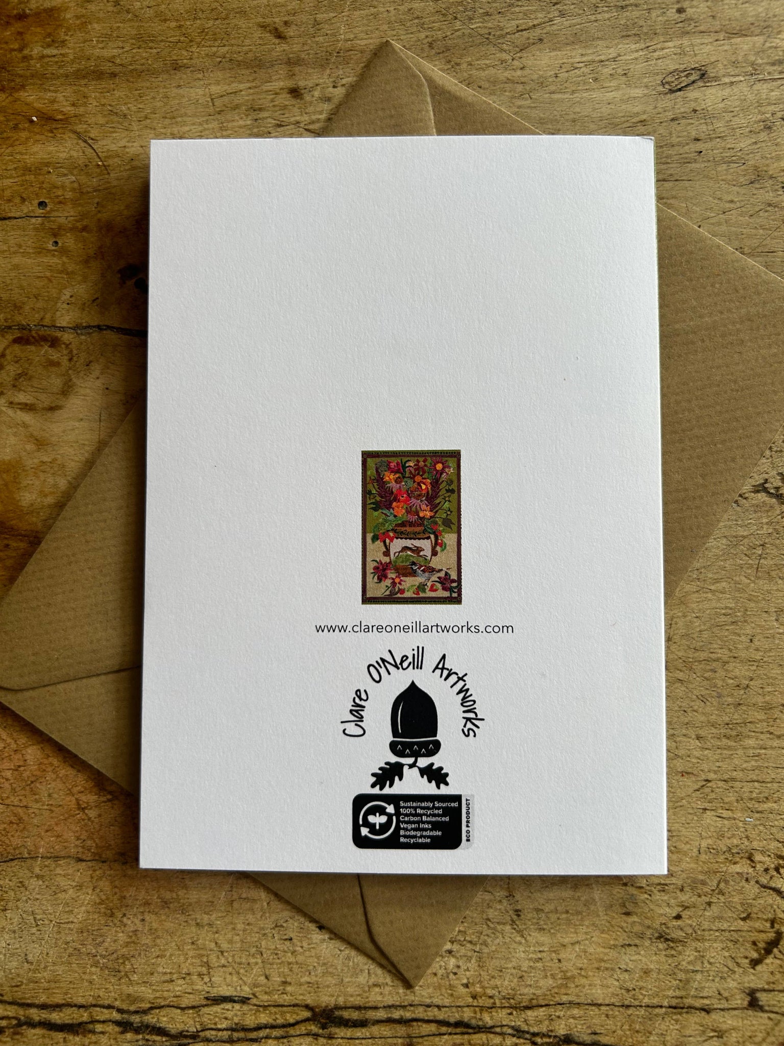 “Berries and Blooms” blank greeting card measuring approx. 4.25" wide x5.75" long Design and printed on 100% recycled, uncoated cardstock. Design Digitally printed using high pigment eco friendly toners for colours that are strong and vibrant. All cards are blank inside for your own personal message. A beautifully illustrated card paired with a brown A6 Kraft envelope and wrapped in a cellophane sleeve.