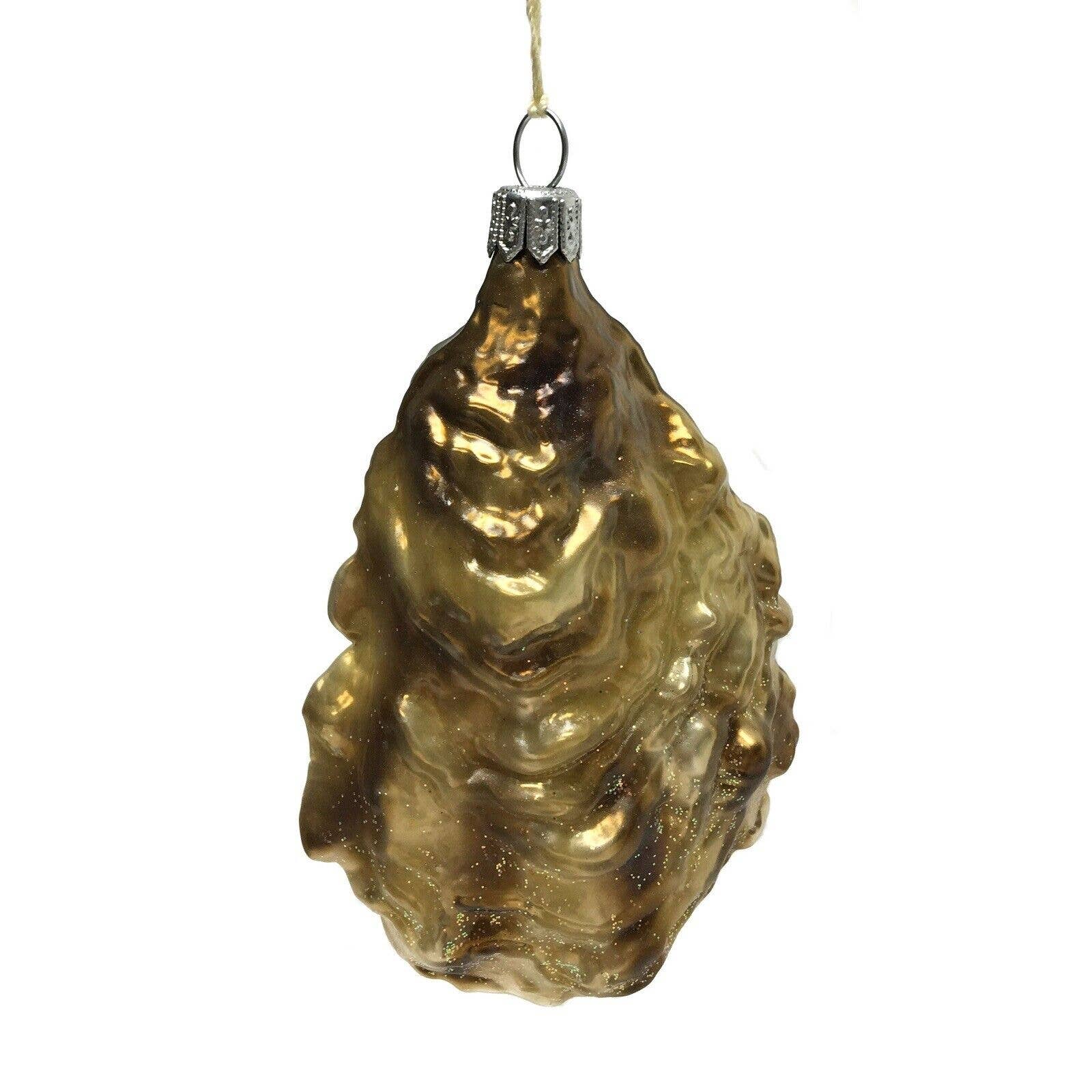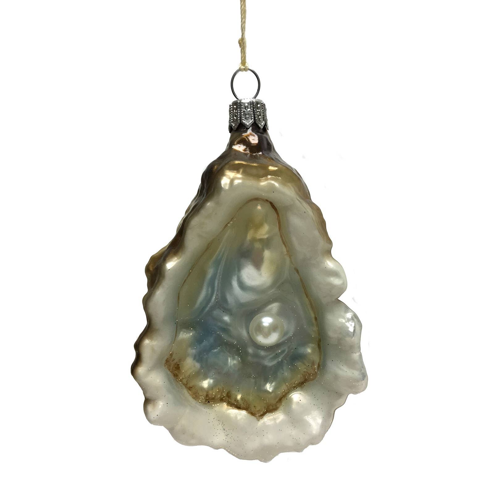 Oyster with Pearl Ornament handcrafted & painted in Poland. Made from mouth blown glass measuring approximately 2.5 x 1 x 4 inches.