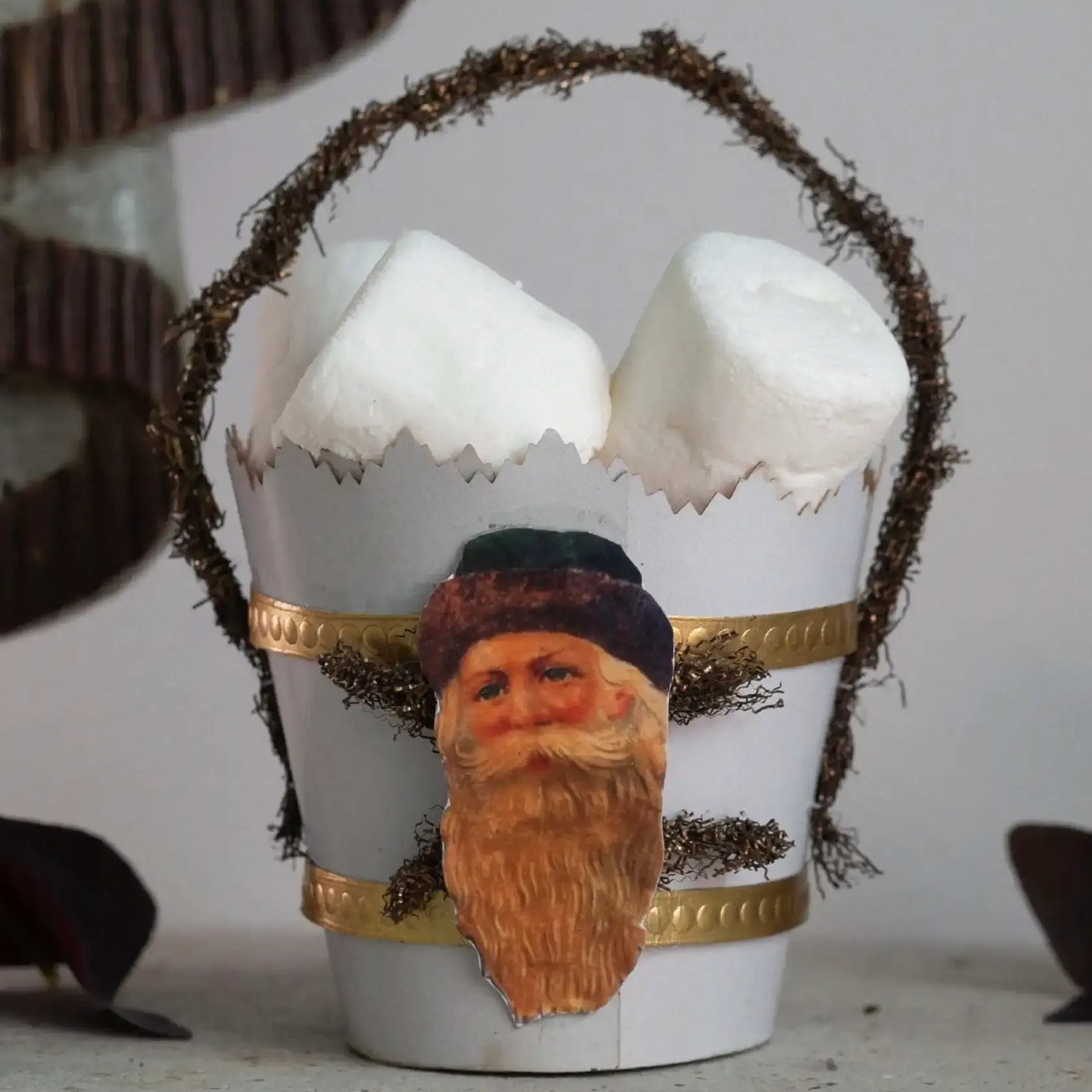 Inspired by an actual 1900s candy container, this charming ornament is a nostalgic tribute to vintage Christmas traditions. The paper has been meticulously hand-dyed to match the exact pale blue hue of the original antique, giving it an authentic, timeworn feel. At the center of the piece is a glossy, vintage-style image of Santa Claus, his warm expression reminiscent of early 20th-century holiday illustrations. Measures approx. 4.7" high.